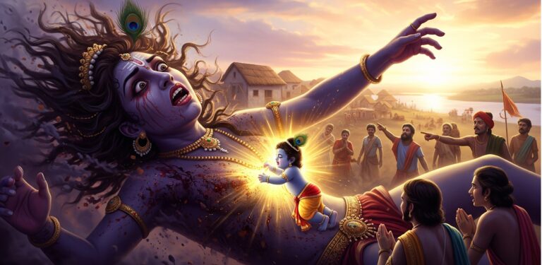 Putana fell lifeless, assuming her gigantic demonic form. But Krishna, with infinite compassion, granted her moksha — liberation, as if she were His very mother. The people of Gokul marveled at the sight, realizing that this divine child was not ordinary.