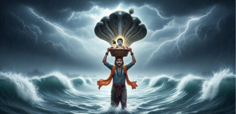 On the stormy night of Krishna’s birth, His father Vasudeva carried the newborn across the mighty river Yamuna. Dark clouds roared, rain poured, and the river swelled with fierce waves. Yet when Yamuna saw the Divine Child resting in Vasudeva’s arms, her heart overflowed with devotion.