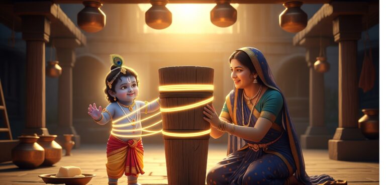 One day, after endless pranks and butter thefts, Yashoda Maiya decided to discipline little Krishna. With determination, she tried to tie Him to a heavy grinding mortar (ukhal) to keep Him in place. But a divine mystery unfolded: every rope she tied was always two fingers short. She brought more rope, tied again — yet it still remained short.