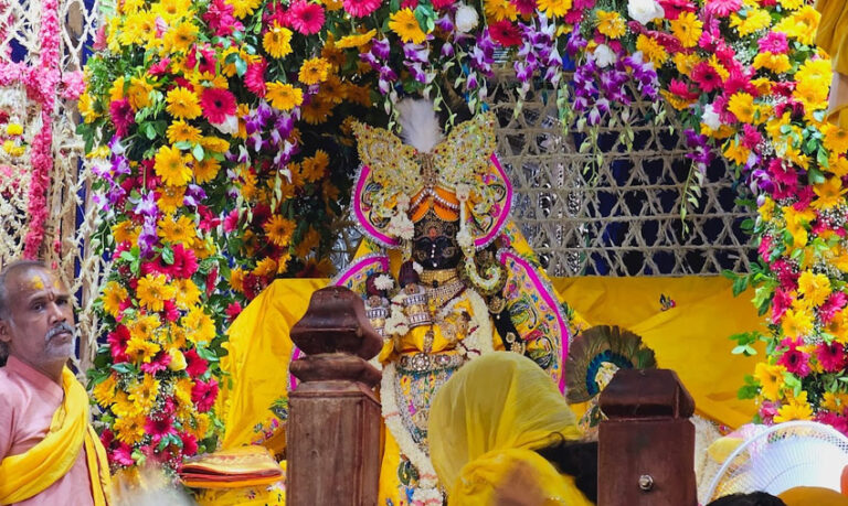 The most beloved deity of Vrindavan, Shri Banke Bihari, resides here — enchanting every heart with His madhurya svarupa, the sweet, ever-youthful form of Krishna.
